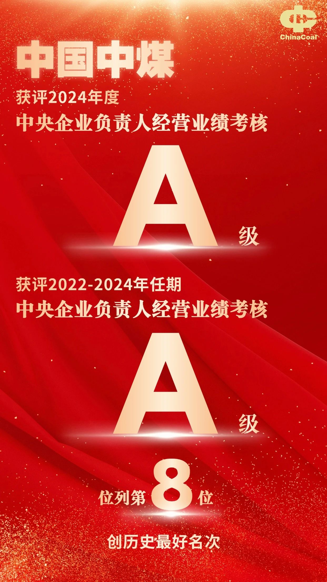 日前,國務(wù)院國資委公布了2024年度和2022-2024年任期中央企業(yè)負(fù)責(zé)人經(jīng)營業(yè)績考核A級企業(yè)名單,中國中煤獲評2024年度中央企業(yè)負(fù)責(zé)人經(jīng)營業(yè)績考核A級和2022-2024年任期中央企業(yè)負(fù)責(zé)人經(jīng)營業(yè)績考核A級。中國中煤已連續(xù)6年獲評年度經(jīng)營業(yè)績考核A級企業(yè);連續(xù)兩個任期獲得中央企業(yè)負(fù)責(zé)人經(jīng)營業(yè)績考核A級,2022-2024任期考核排名第8位,創(chuàng)歷史最好名次。此外,中國中煤還獲評2024年度中央企業(yè)黨建工作責(zé)任制考核A級、董事會2024年度評價“優(yōu)秀”等次。