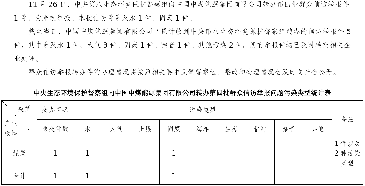 中央第八生態環境保護督察組向中國中煤能源集團有限公司轉辦第四批群眾信訪舉報件