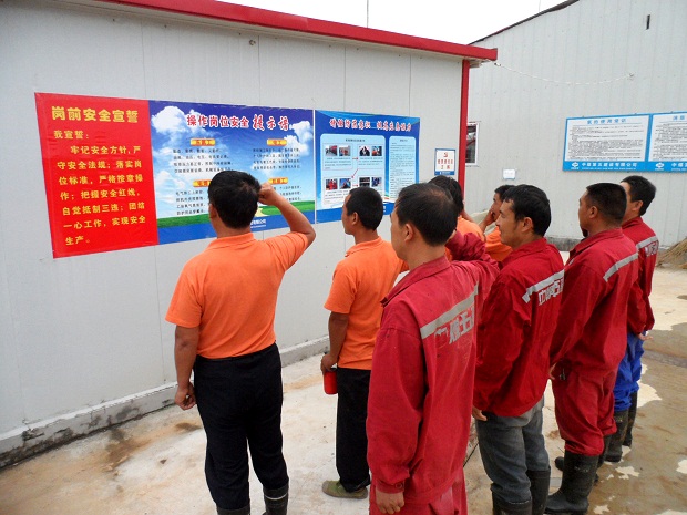 每天上崗前,各工種職工都會聚集在凍結車間門口,開展崗前安全宣誓活動。崗前宣誓作為項目部班組交接班工作的重要內(nèi)容,是接班員工必須履行的工作程序。它不僅僅是一種形式,而且是對安全工作的一種提示,對安全責任的一種提示,通過這種必要的、有效的形式來推動和促進項目部安全生產(chǎn)。