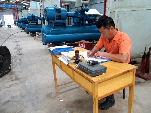 班組進行安全隱患排查,班長正在檢測滅火器壓力是否達標